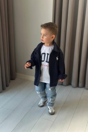 %100 Pamuklu kısa kollu tshirt, ince mevsimlik ceket ve beli ayarlanabilir kot pantolona sahiptir.