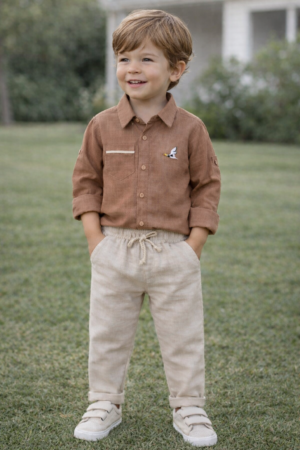 Nakış Detaylı Keten Gömlek Pantolon Takım (Kahve)