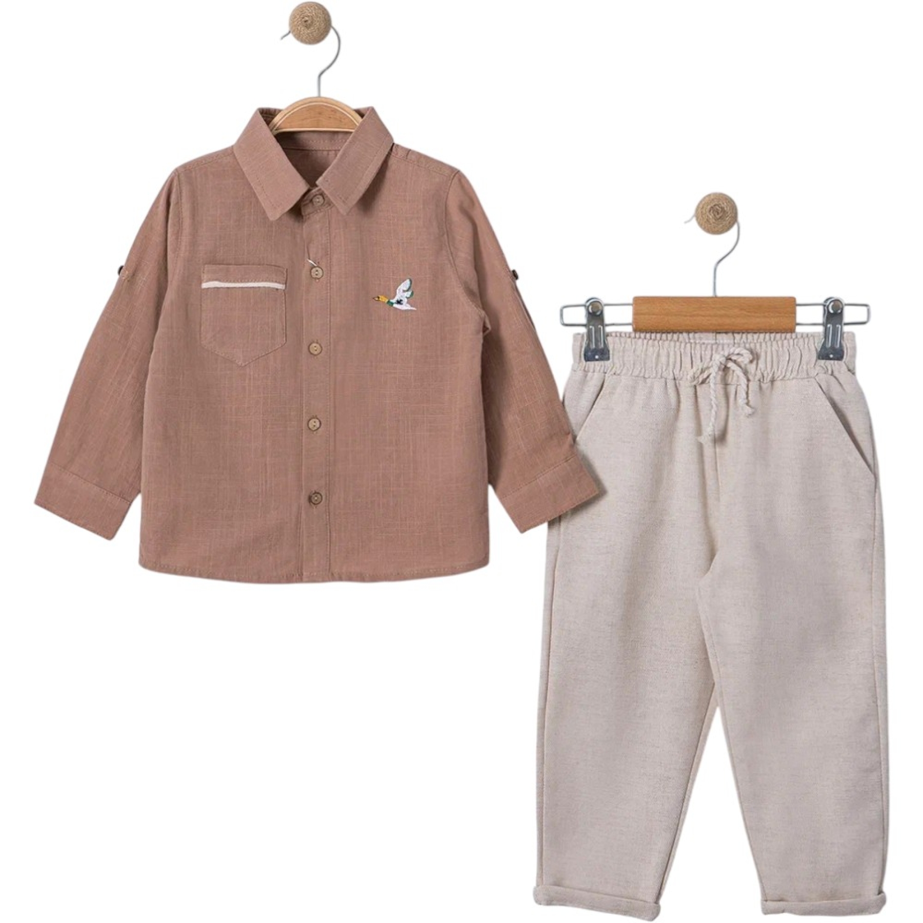 %100 pamuklu keten gömlek ve pantolondan oluşmaktadır