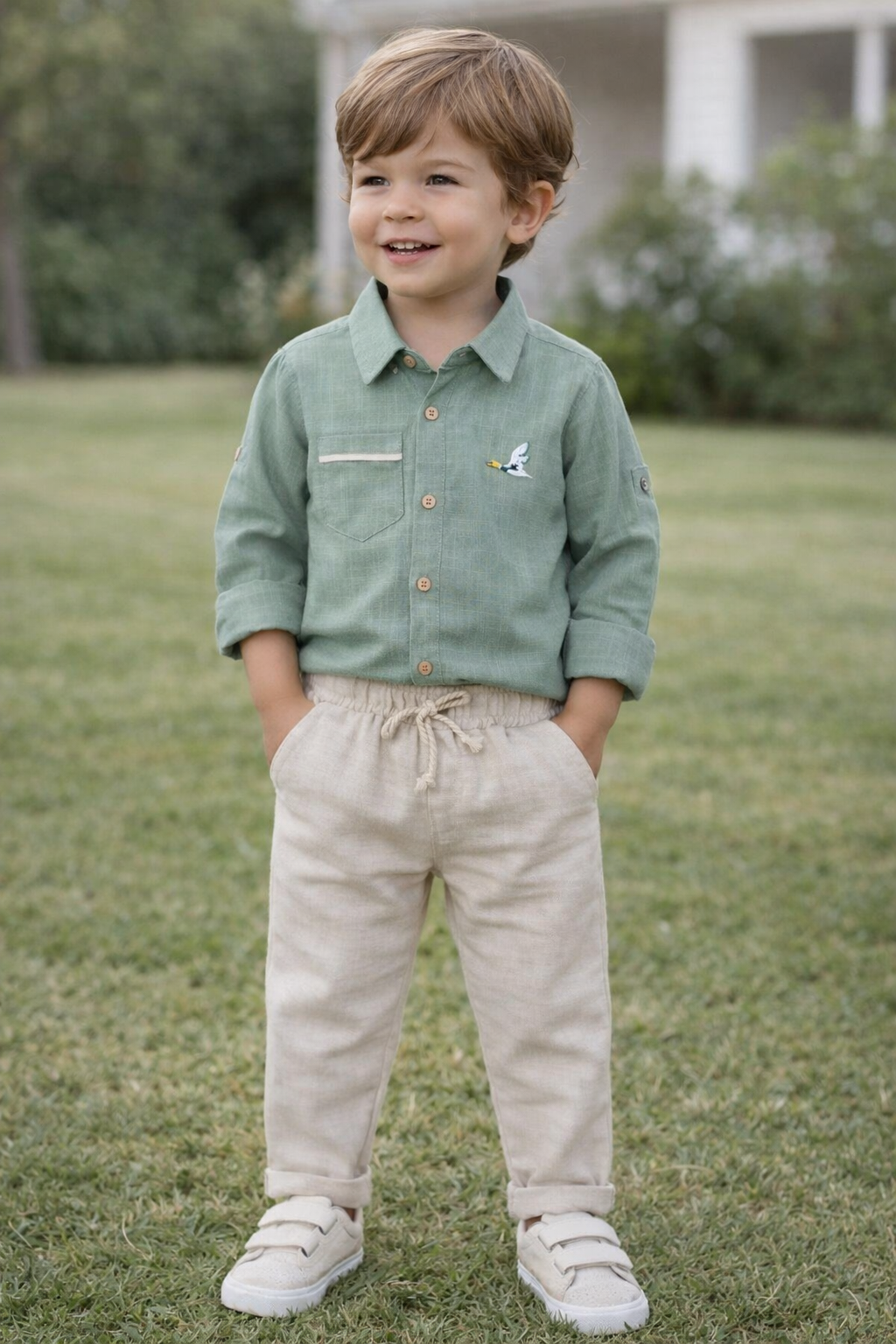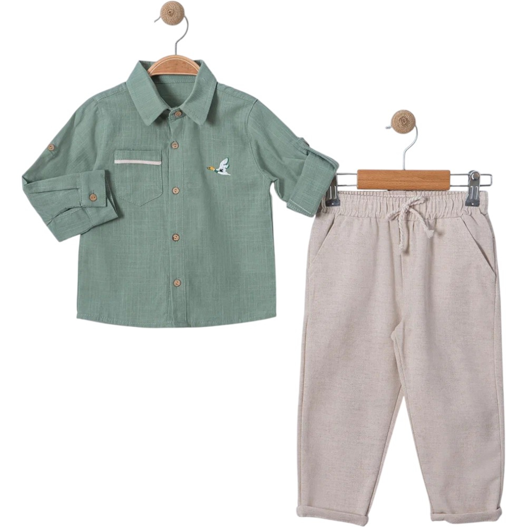 %100 pamuklu keten gömlek ve pantolondan oluşmaktadır