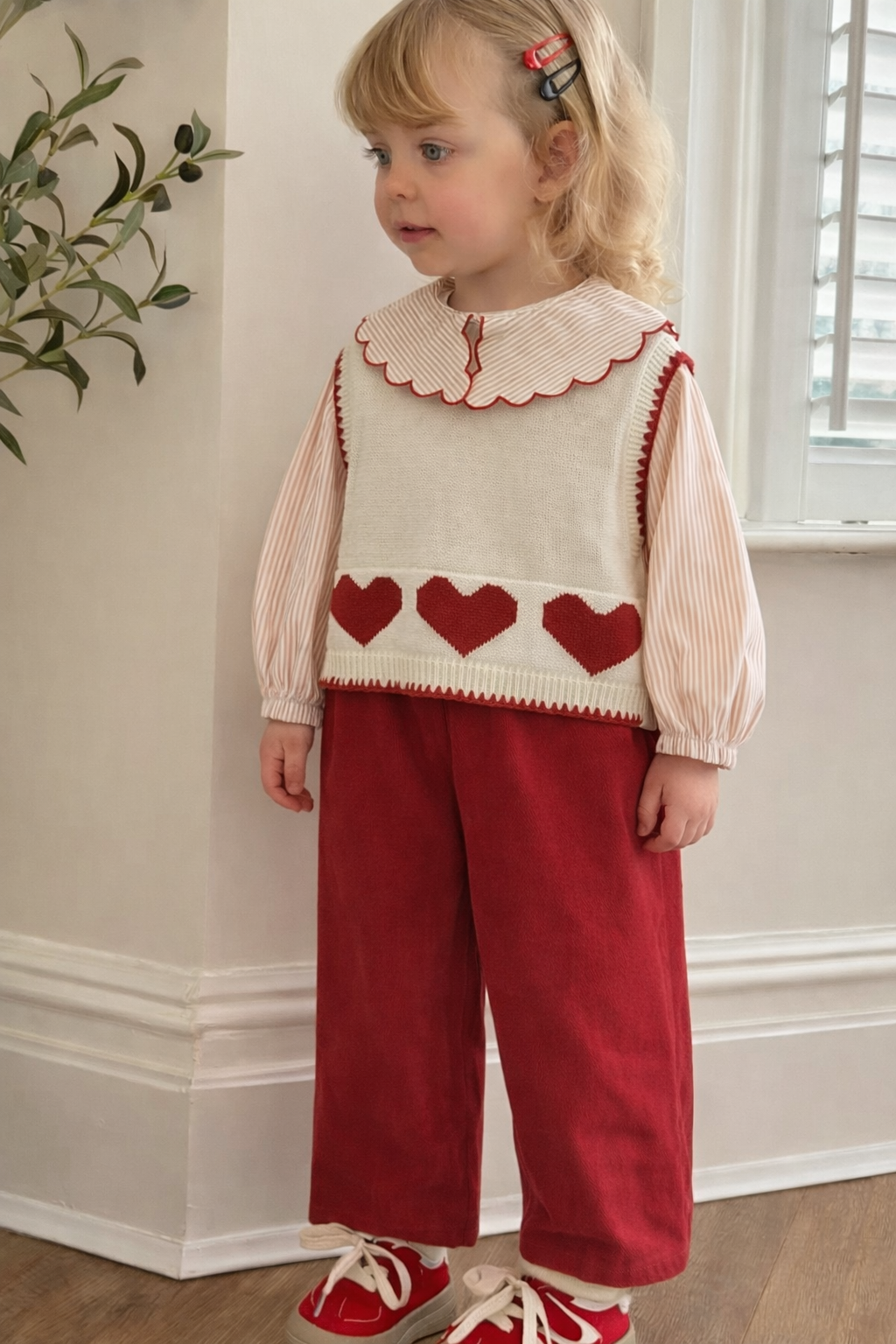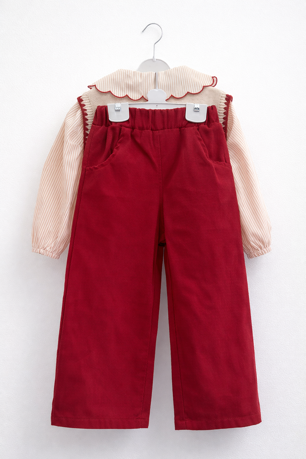 Beli lastikli pantolon, gömlek ve triko süveterden oluşmaktadır